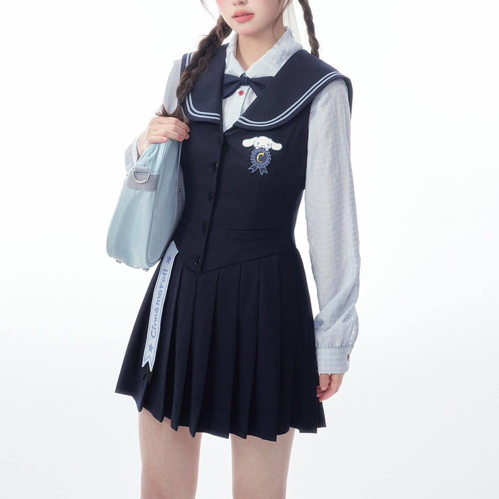 Elevate your casual style with the Cinnamoroll Jumper Dress from the KYOUKO collaboration! This figure-flattering low-waist dress in classic navy features a sailor collar, delicate Cinnamoroll print ribbon at the hem, and signature character embroidery. Designed to accentuate your silhouette, it's the perfect versatile piece for layering or wearing on its own.